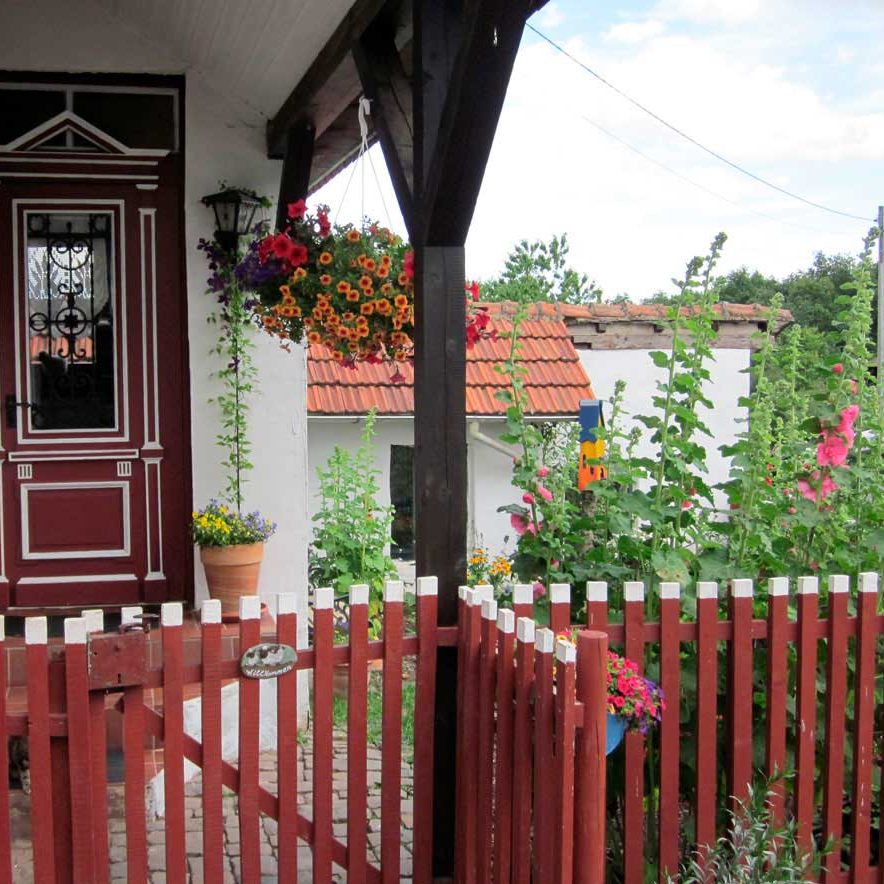 Vorbei an dem eingezäunten Vorgarten, in dem auch Kinder gefahrlos spielen könnten, führt eine alte, liebevoll gestaltete Haustür über einen Windfang ins Innere des Hauses.